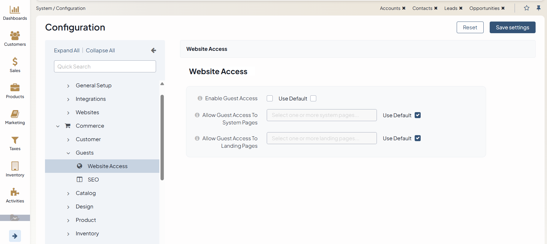 Enable website access for guests to allow guest customers interact with your website. When this option is disabled, the only page that unregistered users can access is the login page, unless specific system or landing pages are explicitly allowed for guest access in the configuration. Starting from OroCommerce version 6.1.7, when guest access is disabled, administrators can optionally allow guest users to access a limited set of system pages (such as legal or informational pages) and landing (CMS) pages. This makes it possible to keep selected content publicly available while restricting access to the rest of the storefront.