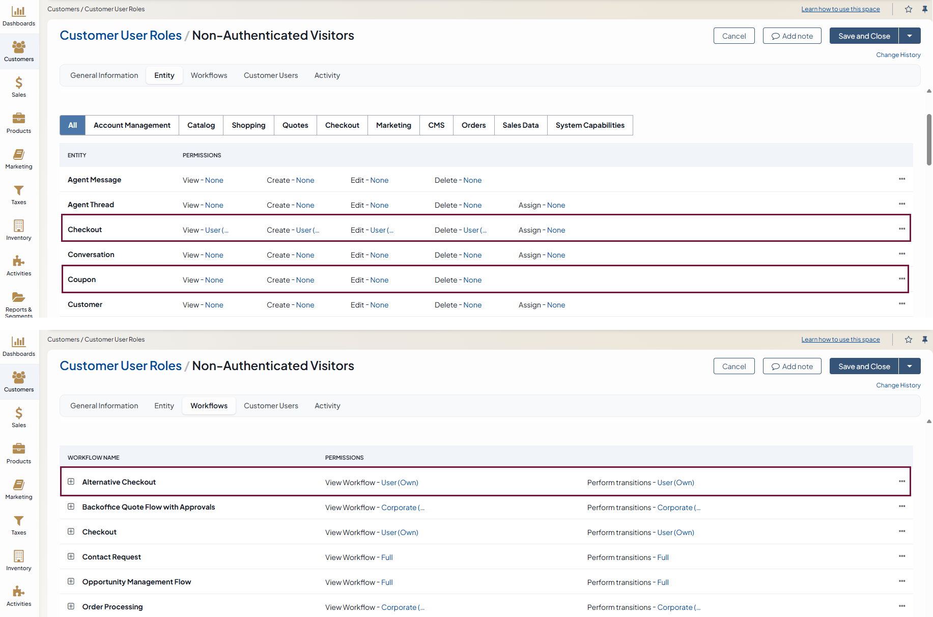 For example, you can activate the guest shopping list option but restrict the ability to delete it, or activate the guest checkout but disable coupon usage unless a guest user registers. You can add the necessary workflow to cover the needs of guest customers, such as an alternative or a single page checkout by assigning the required permissions. These and other access options are available for any customization depending on your business needs under Customers > Customer User Roles in the system configuration.