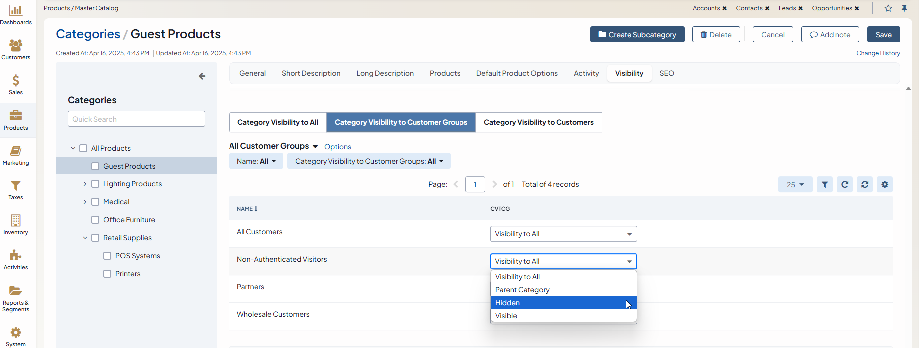 From the master catalog page. Here, you can combine the specific products which visibility you want to manage into one category (for example, Guest Products) and set the necessary restrictions to the whole category. This way, you are free to customize the way your categories are displayed in the storefront. For instance, you can hide the Guest Products category from your registered customers and only enable the Non-Authenticated Visitors segment to view the products from this category.