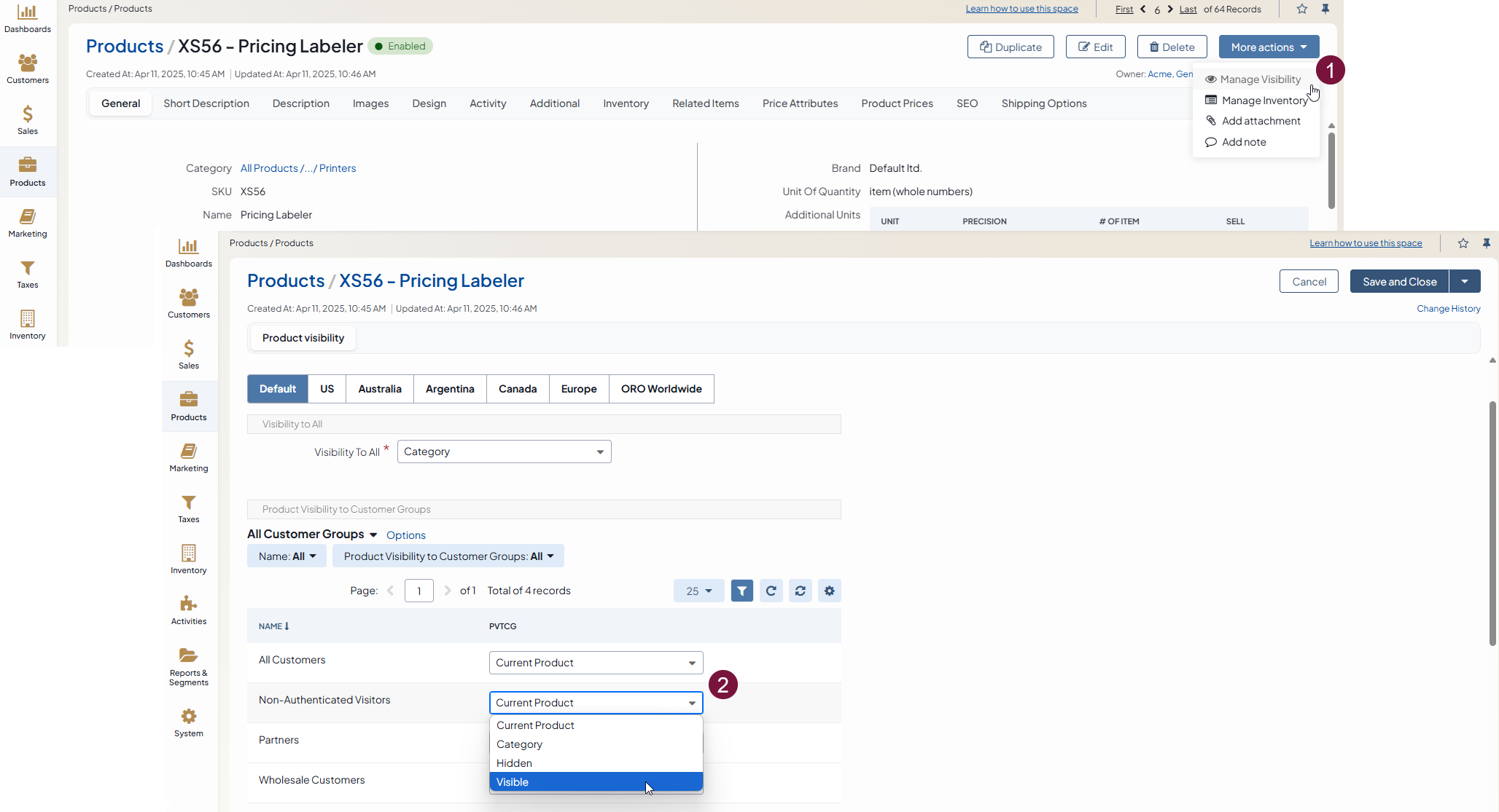 From the page of a required product. This way, you can selectively display the necessary product to guest customers, or hide it completely. It is useful when you sell a product to your partners only, and you do not want other retail customers to view it.