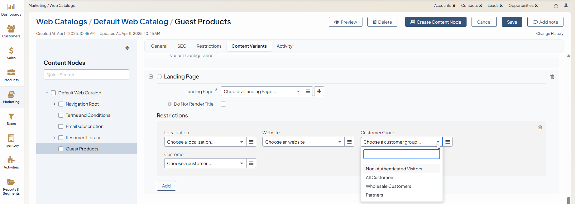 From a web catalog page. This setting follows the same configuration logic as for the master catalog. However, along with the visibility restrictions set to a web catalog node, you can also customize the visibility settings for a landing page and other content variants added to your web catalog.