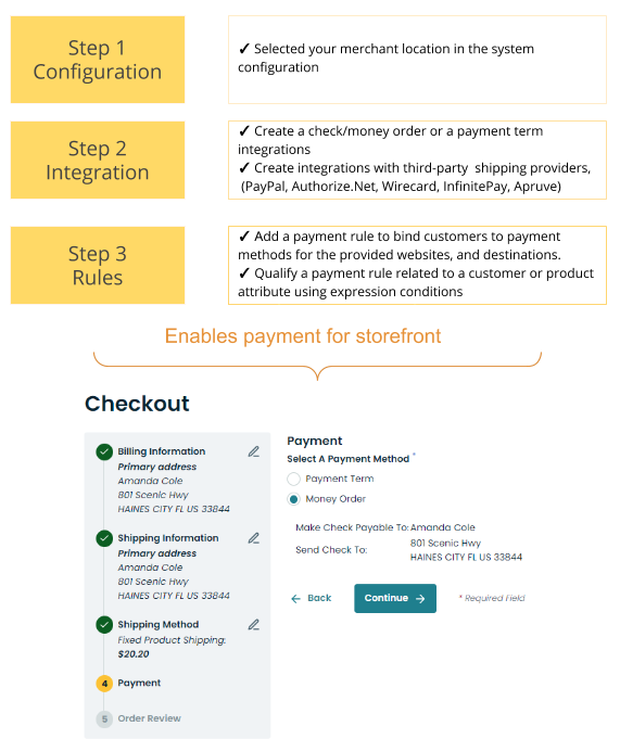 Once the integration is set up and a payment method is added, you need to add a payment rule to make this payment option visible to the buyer in the storefront. When this is done, the buyer in the storefront can proceed through the checkout.