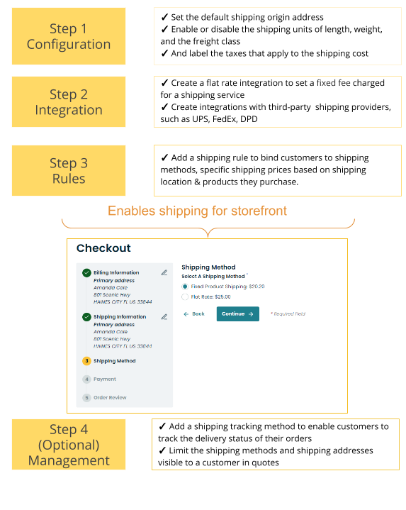 To facilitate global B2B sales, you can configure various shipping methods for particular locations, integrate local shipping providers, or the best shipping plans whenever possible.