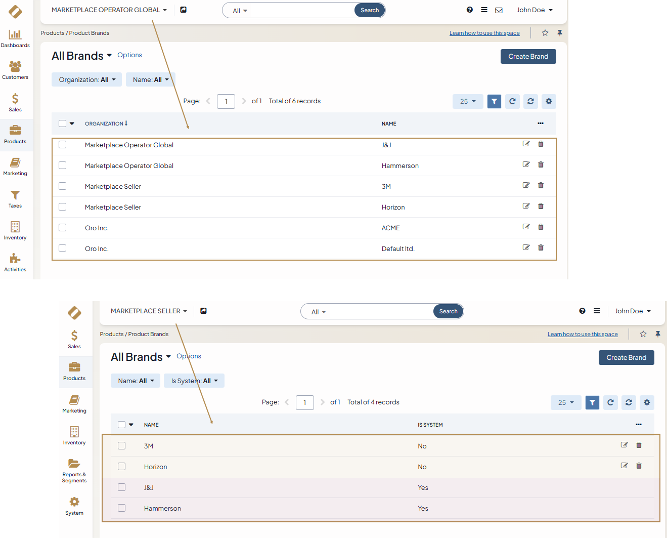 You can associate each product with a specific product brand. Brands can be managed by the marketplace owner, a seller, or both. Depending on the requirements, permissions to view, create, and edit brands are toggled per role. However, sellers cannot edit or delete brands created in the global marketplace organization from within their respective organizations. Sellers can only see brands created in their organization and the global marketplace organization and cannot view or in any way affect the brands of other sellers. There is no limit to the number of brands that can be created in any given organization.