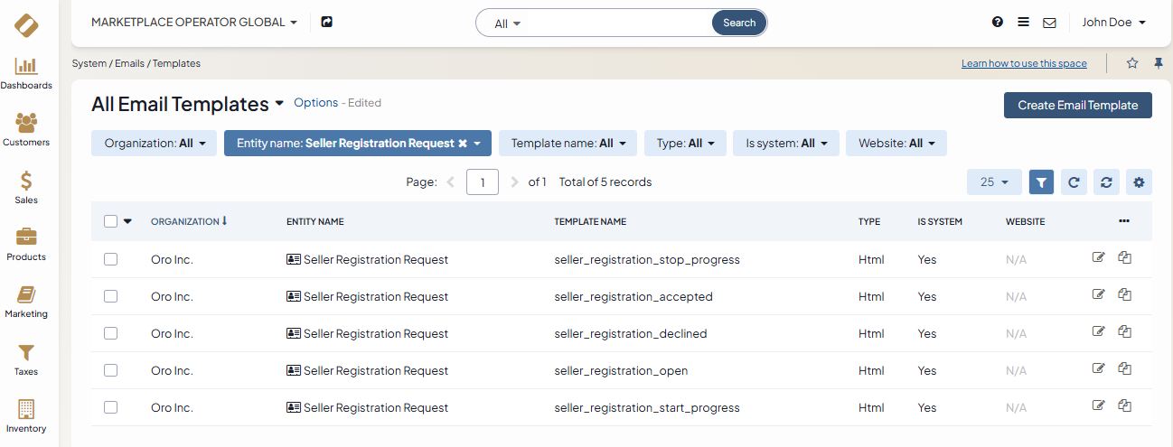 A person responsible for registration in the marketplace owner organization (marketplace operator) can then start processing the request, accept it immediately, or decline it using the back-office Seller Registration Request workflow. Once accepted, the seller will be assigned a username and receive access to their own newly created seller organization in OroMarketplace. At each step of registration, an email is sent to the seller informing them about the progress of his application.