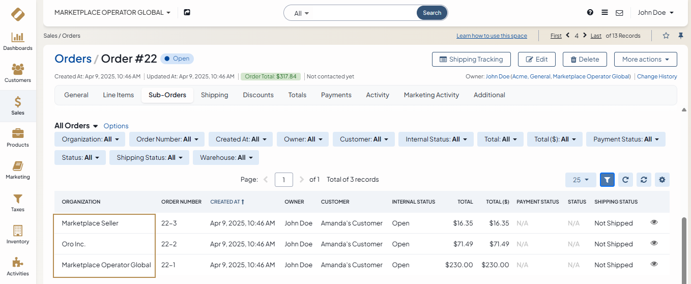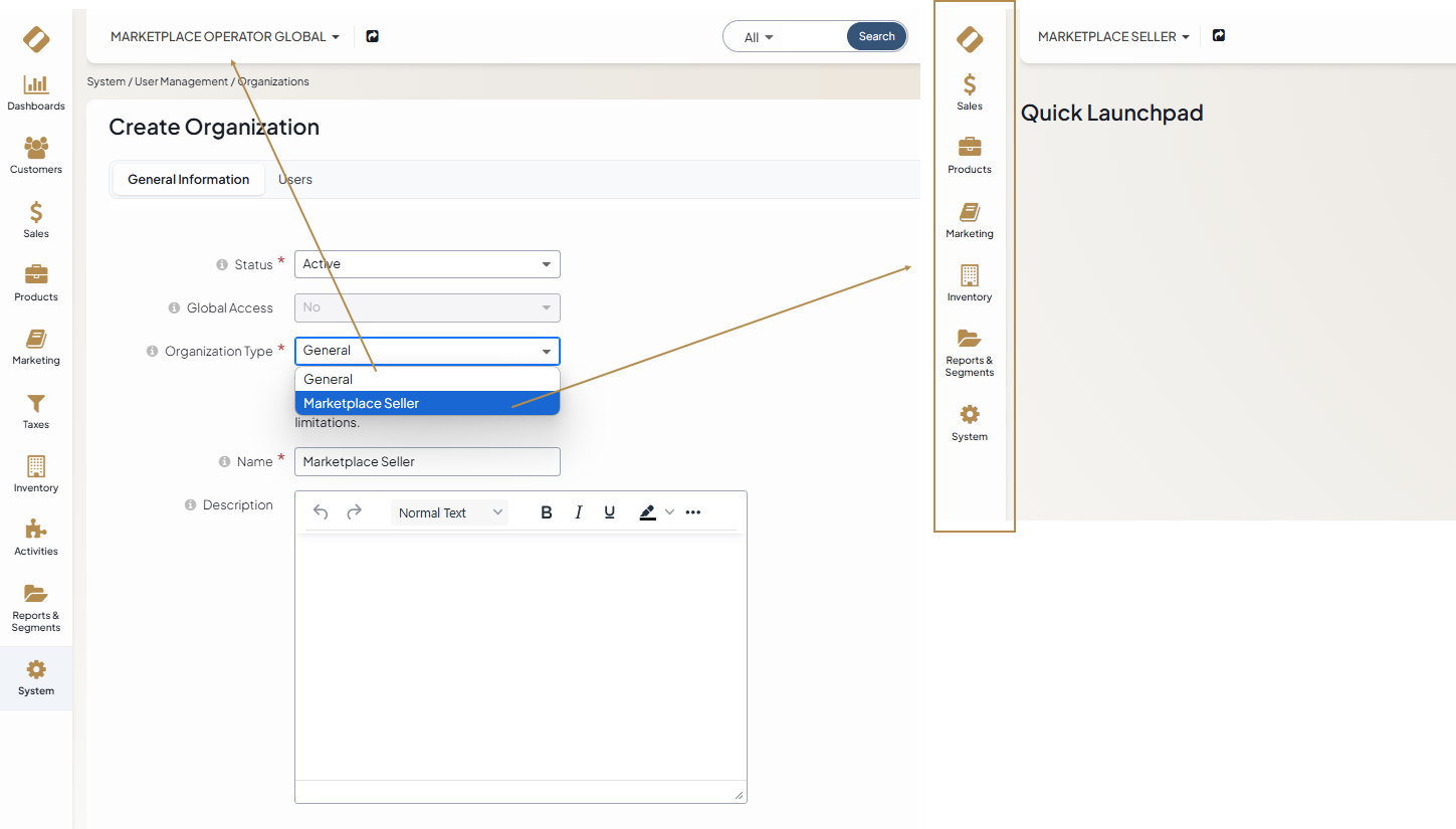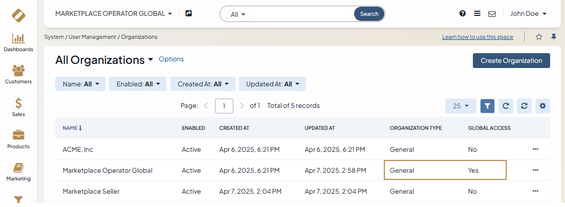 Marketplace Operator must be of the General organization type to access all application functionality without restrictions. It must also have a global access level to create a seller organization and view records of other sellers. Please be aware that the Oro application can have only one organization with global access level.
