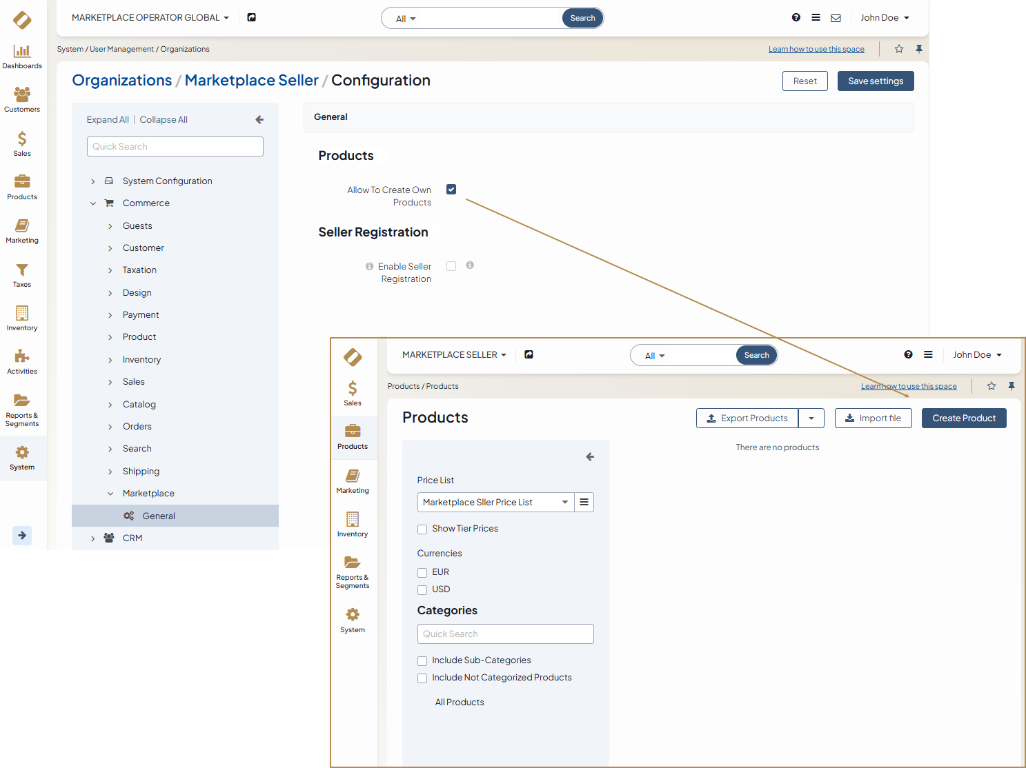 By default, all sellers can create new products in their organization. This capability can be toggled in the configuration settings of each organization, if necessary.