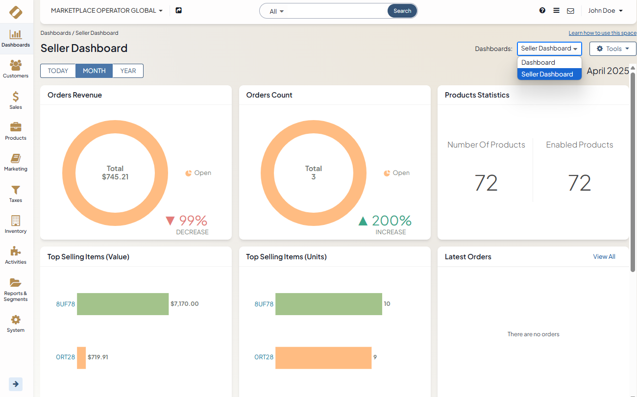 Dashboards are typically the first thing merchants see when they log in to the back-office. In addition to out-of-the-box widget dashboards that provide significant business KPIs, OroMarketplace offers an additional dashboard for sellers demonstrating e-commerce statistics for orders revenue and count, product statistics, and top-selling items. It is an interactive dashboard that also breaks this information down over a period of time, allowing sellers to analyze nearly any aspect of their business. There is no limit to how many dashboards of this type a seller can create in their organization.