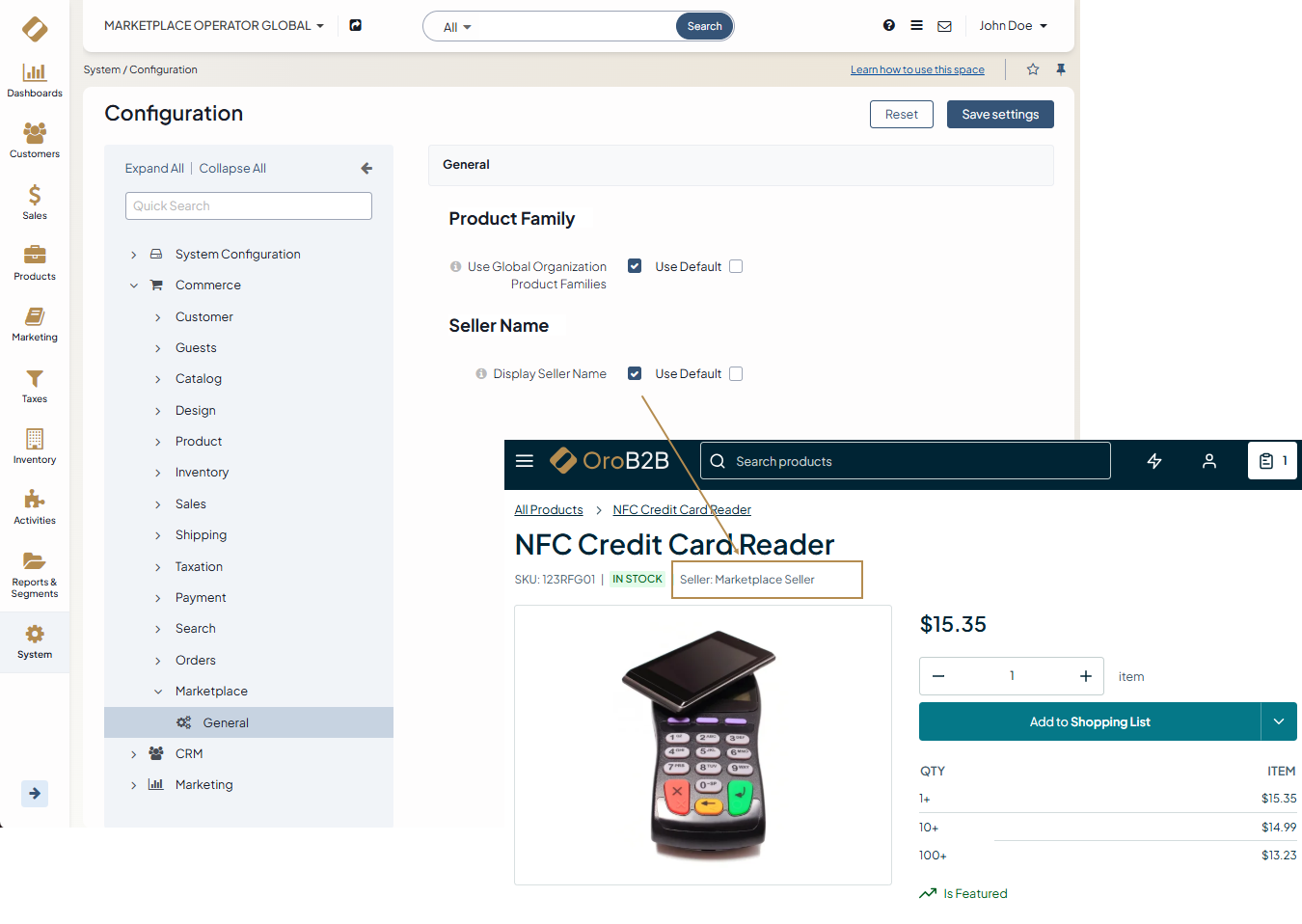 Sellers manage their own inventory, warehouses, and products, but the global marketplace organization stores all products from all sellers, which makes it possible to browse all existing products on the global storefront website. All products in the storefront display the name of the seller in product listings, product details, shopping lists, and on order pages. This is a feature that a marketplace owner can toggle in the global system configuration and per organization.