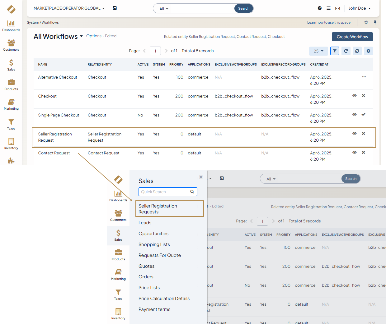 A seller registration request can also be created via the back-office under Sales > Seller Registration Requests in the marketplace owner organization, provided that the person managing such requests has the details of the prospective seller. They can also create a seller organization via the back-office straight away. In both cases, the process is manual and a designated person from the marketplace owner organization must create a user for the new seller organization so they could log in to their back-office, in addition to setting up inventory and warehouse, and one default price list.