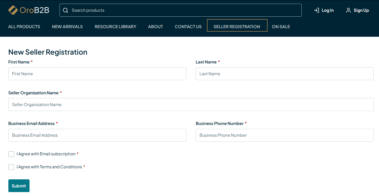 The details provided in the registration form are immediately displayed in the OroMarketplace back-office under Sales > Seller Registration Requests, where you can view every such request and transition it through the corresponding workflow.