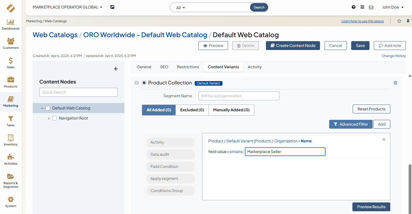 Master Catalog is a tree structure that helps organize products into categories. Administrators of the marketplace owner organization manage a single global master catalog, the structure of which is subsequently shared with all sellers. This way, the products that sellers add from their organization are classified based on existing categories. Sellers cannot affect the structure of the global master catalog. Should they need to place products in a category that does not yet exist, they can always reach out to the manager of the global catalog for assistance. Similarly, if the marketplace owner uses a web catalog to organize products in the storefront, sellers from other organizations cannot affect its structure. It is possible to display products in the storefront by the seller via the web catalog feature. For this, add a condition to a web catalog content variant to filter products by organization attributes of your choice (e.g., name).