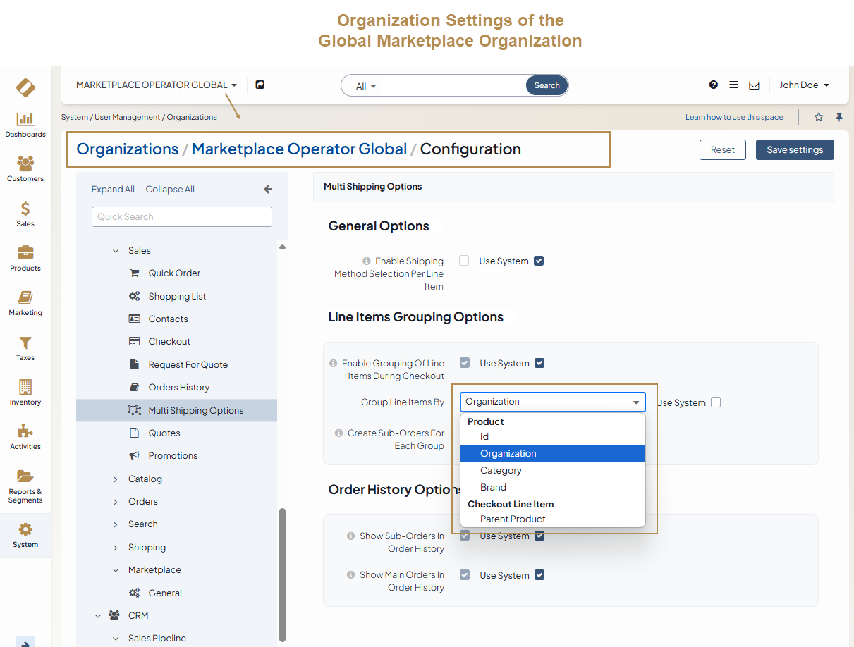 For the orders to be split by seller (i.e., organization), a person responsible for permissions from the global marketplace organization’s owner must enable this capability in the global organization’s configuration settings.