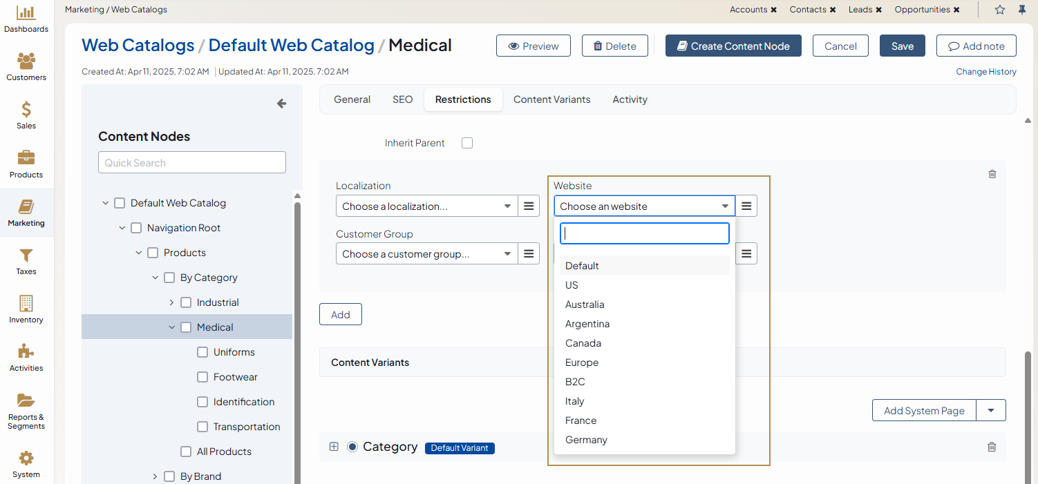 You can modify the default web catalog via the content variants and restrictions. This enables you to toggle the visibility of particular content, product pages, or the whole category specifically for each website.