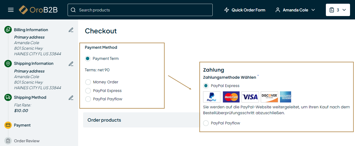 With OroCommerce, you can either share the same payment and shipping methods across all running websites or use only specific ones. You can add the selected providers that would suit a particular website best considering the local delivery and payment options. For example, you can configure four different payment options for the US, while only PayPal would be available in Germany. Any other solution is possible here.