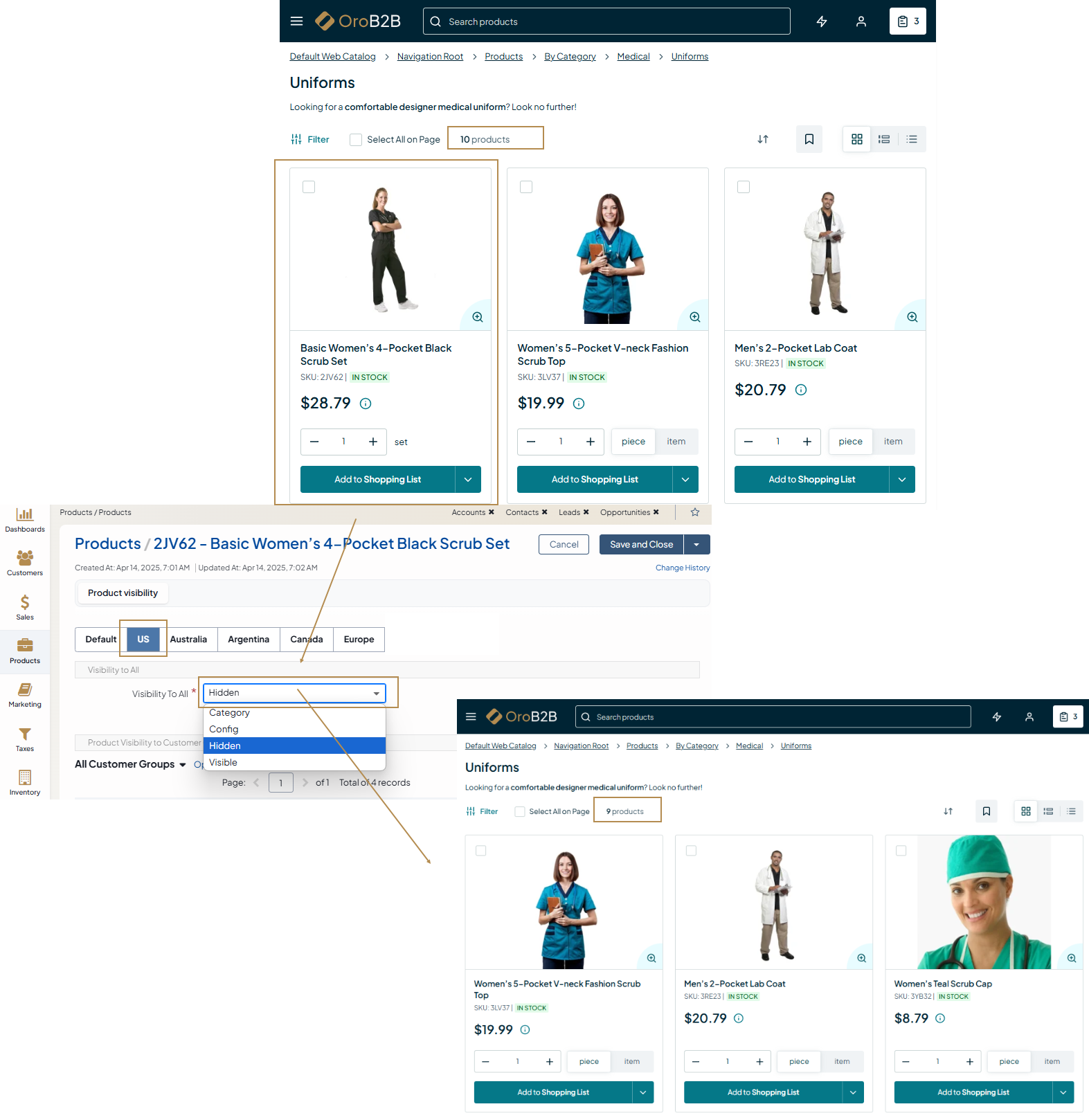 For instance, your subdivision in the US has received a batch of defective products (e.g., medical scrubs) from one of your suppliers. While you are waiting for another batch to replace the faulty one, you may want to keep all the scrubs but hide them on your US website to disable their purchase for a while.