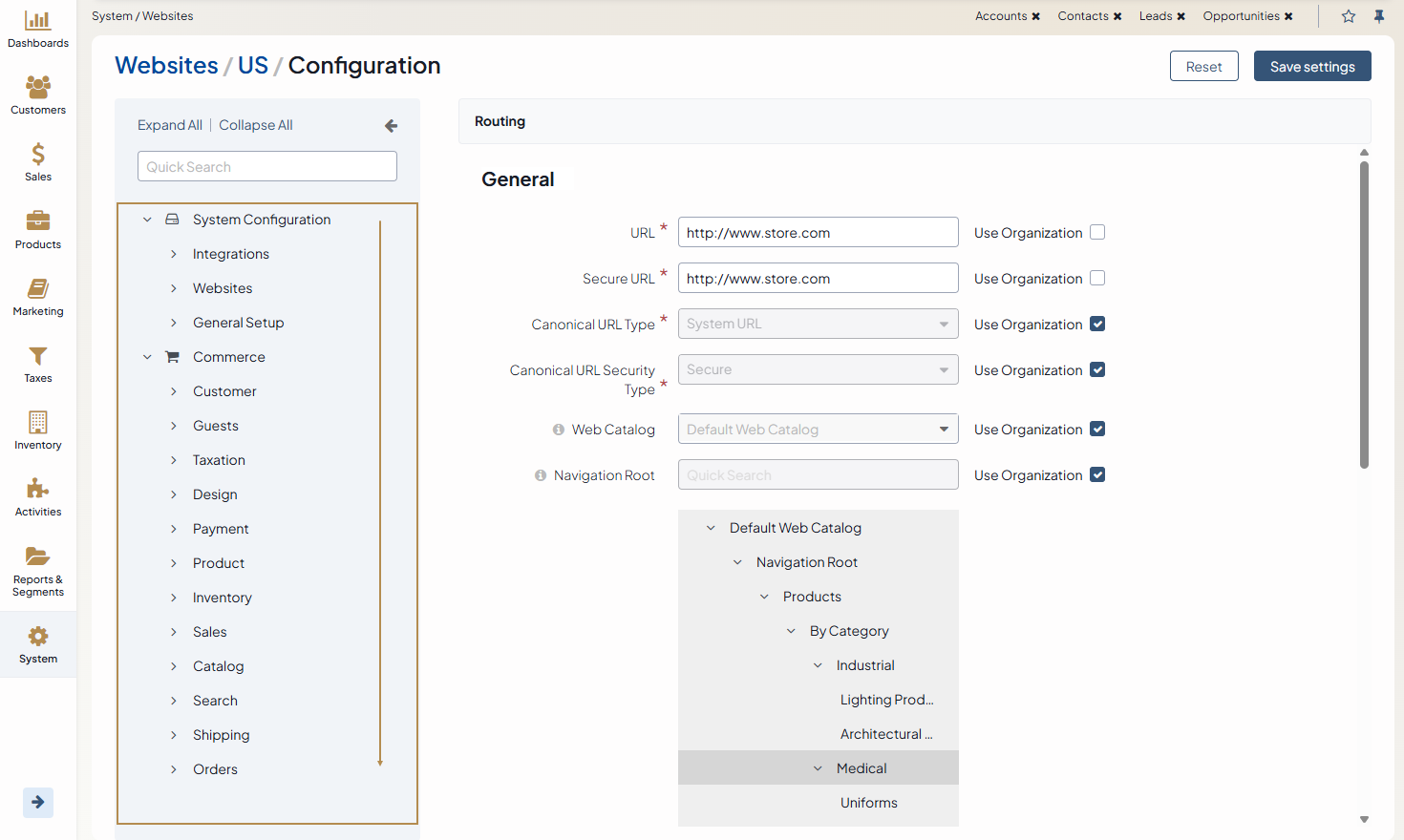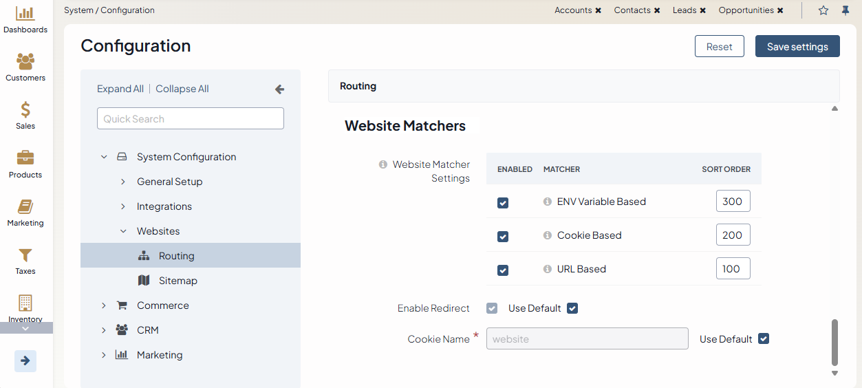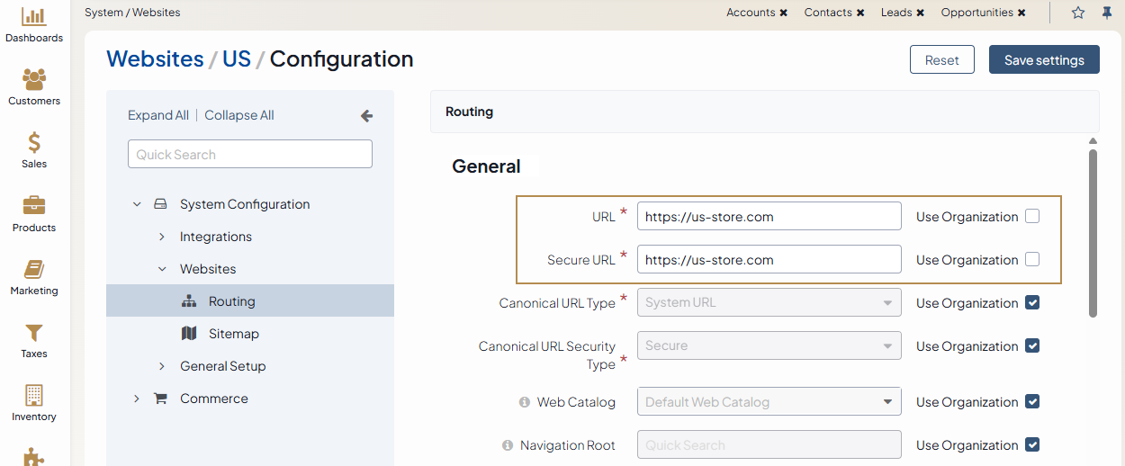 Each website has system settings that can be customized individually per website. The same set of settings are also available on the global and organization levels. Provided that all levels have different configuration, the settings configured for a particular website will always be prioritized first.