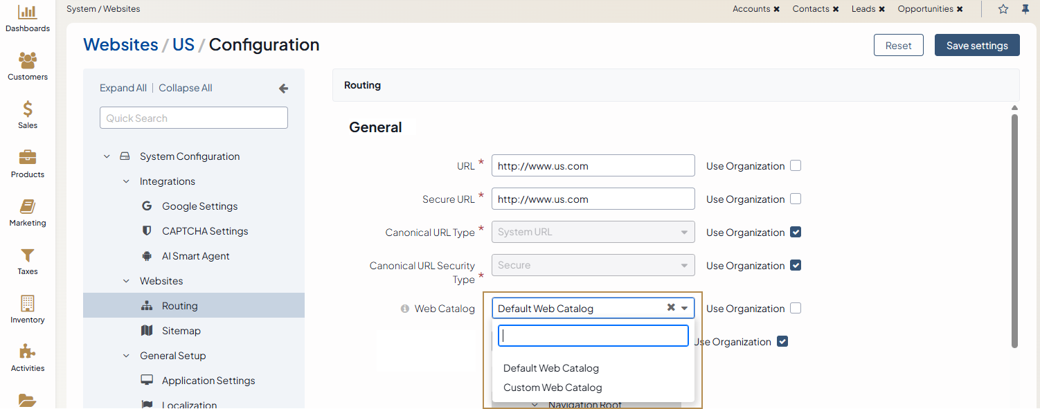 If you deal with multiple brands or provide various services, you may want to separate your businesses to different websites with different domains or subdomains, if necessary. This way, you can configure the appropriate website-specific settings to target the required audience. You can change the domain name, add variable web catalog pages for different websites to showcase your products or services in the desired way, customize price lists, and configure the shipping and payment methods required for specific websites.