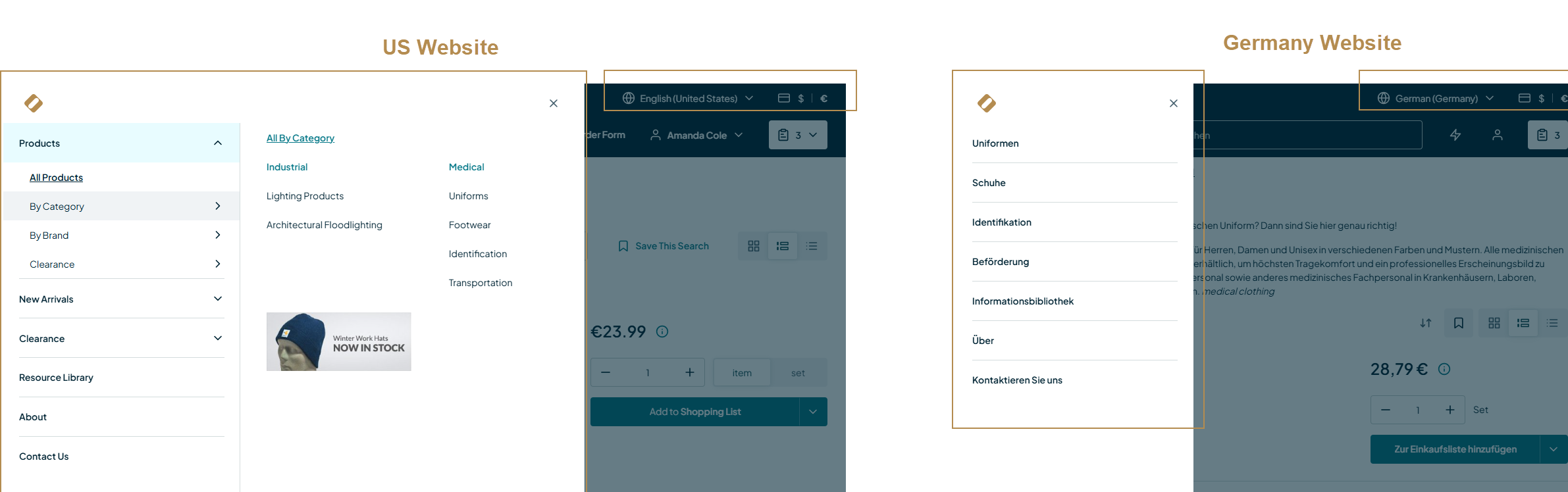 For instance, if you run two different businesses in the US on the same platform, you can diversify the same UI and content elements so the two websites look and feel different. This way, you can change the wording of the same element turning a shopping list from website A into a shopping cart for website B, and a Men’s Basic V-neck, 1-Pocket Light Blue Scrub Top into a simple Men’s Scrub Top with a different product description.