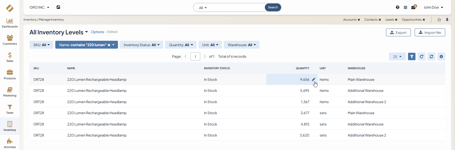 You can adjust product quantity both from the inventory levels page and per product, wherever it is convenient.