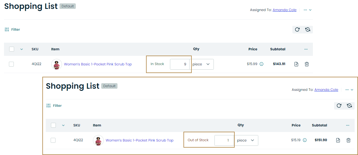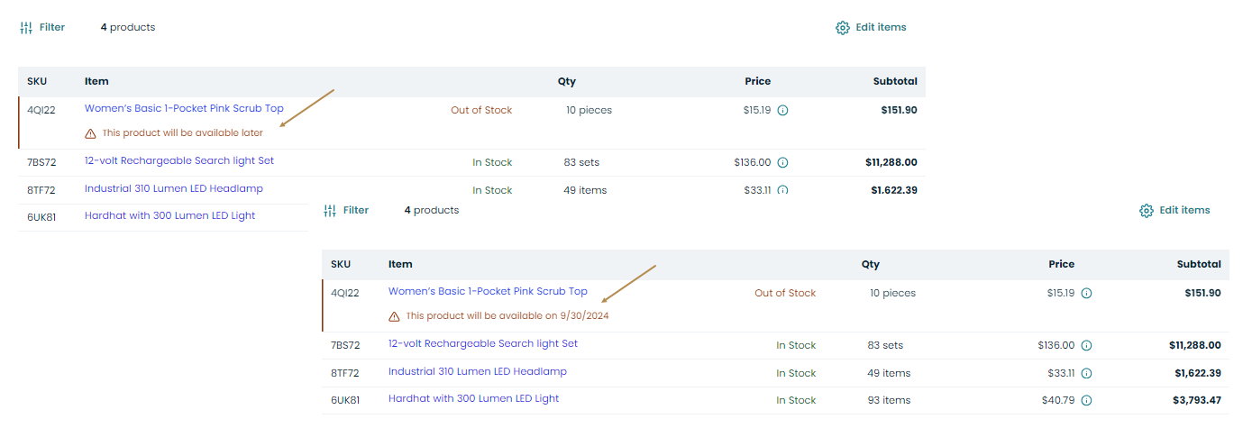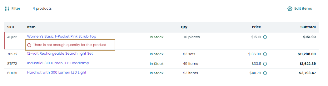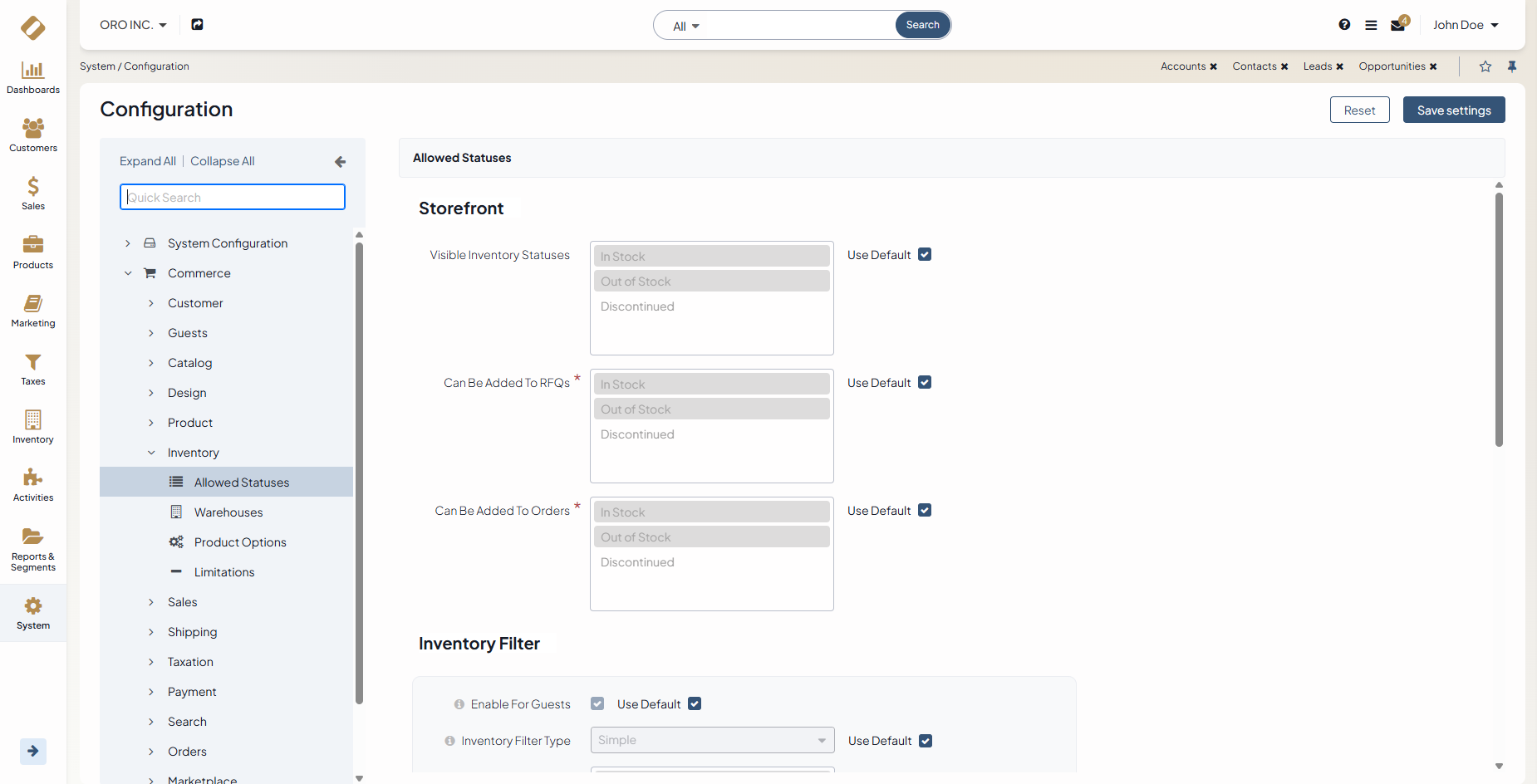 Inventory status defines whether a product is in stock, out of stock, or discontinued. You can select what product status to display to buyers in the storefront and restrict adding the products with a particular status to RFQs, orders, quotes, or shopping lists. These settings can be configured on the system and website levels.