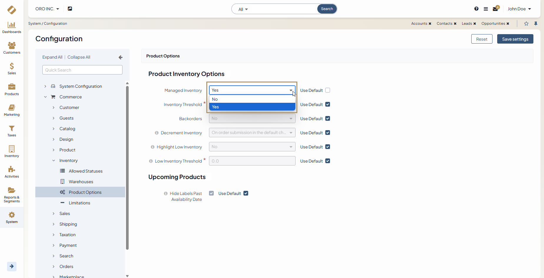 Once you decide which system to use, reflect your choice in the product inventory options configuration by enabling or disabling the full OroCommerce inventory management functionality.
