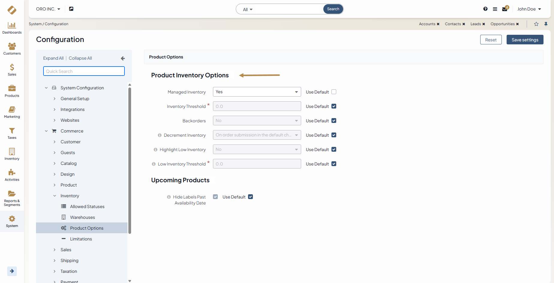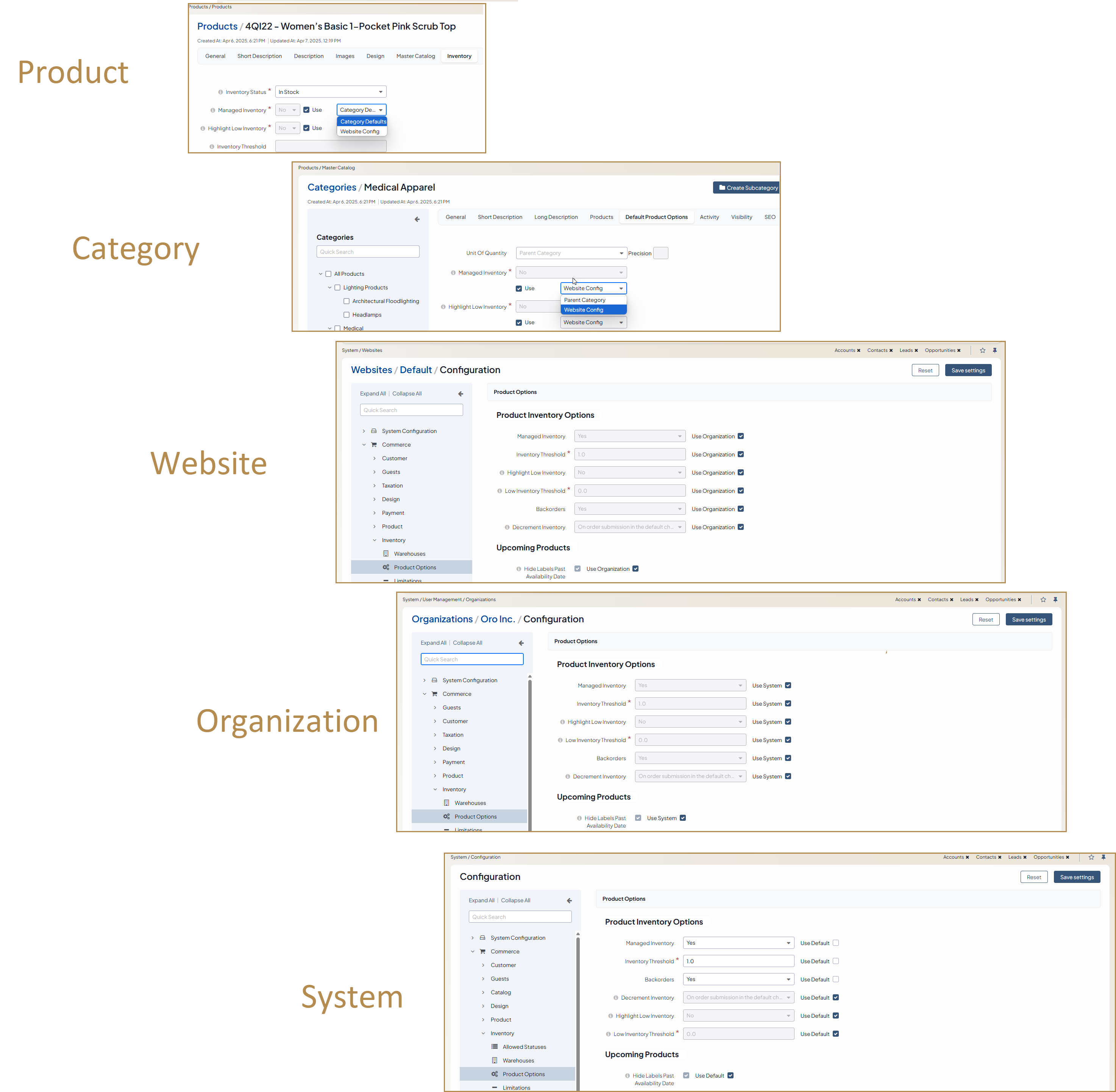 Configuring inventory options allows the inventory to run automatically in the expected customized behavior. It means that once the options are set up, you no longer have to worry about adjusting product quantities after every placed order, notifying customers of any insufficient or out-of-stock products or the pushed back delivery dates. OroCommerce enables you to configure the inventory options on different levels, global, per organization, per website, per product, and per master catalog category, covering various business requirements.