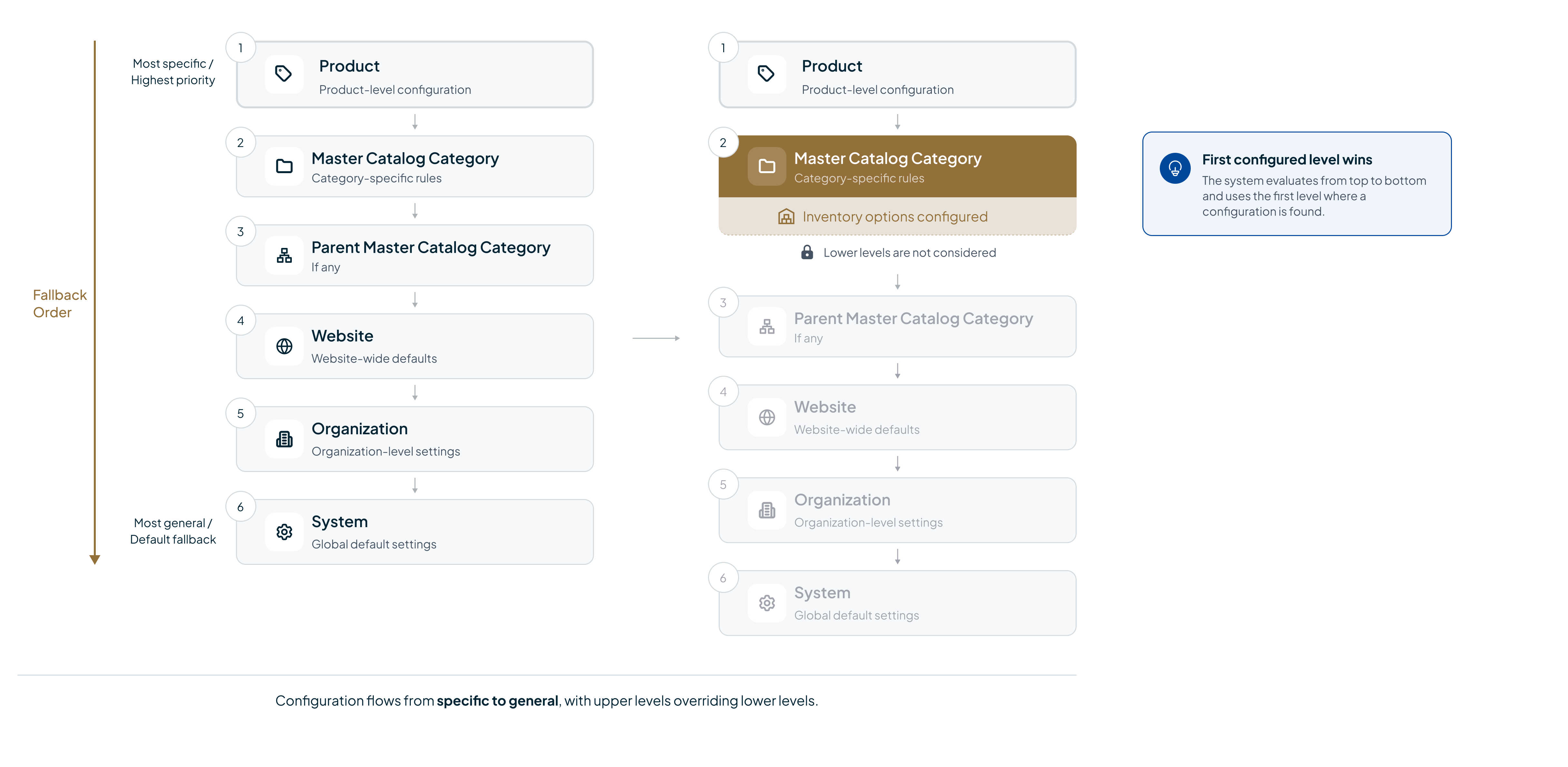 Inventory options can be configured on different levels. To help you understand the inventory option fallback hierarchy, have a look at the illustration of the logic below: