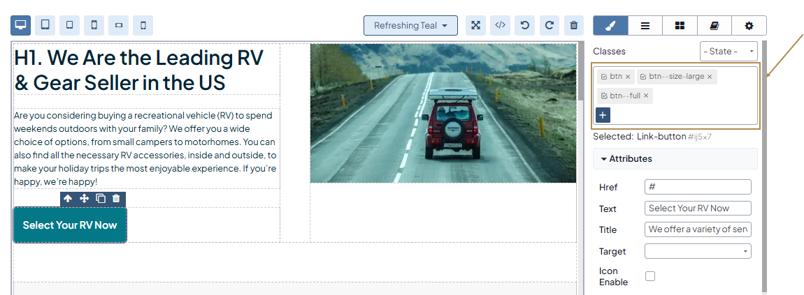 To apply the existing CSS styles to an HTML element, you need to select the required block and enter the CSS style name in the Classes field under Style Manager. The style attribute with its defined properties and values is immediately assigned to the selected block. You can preview the changes directly in the WYSIWYG editor.
