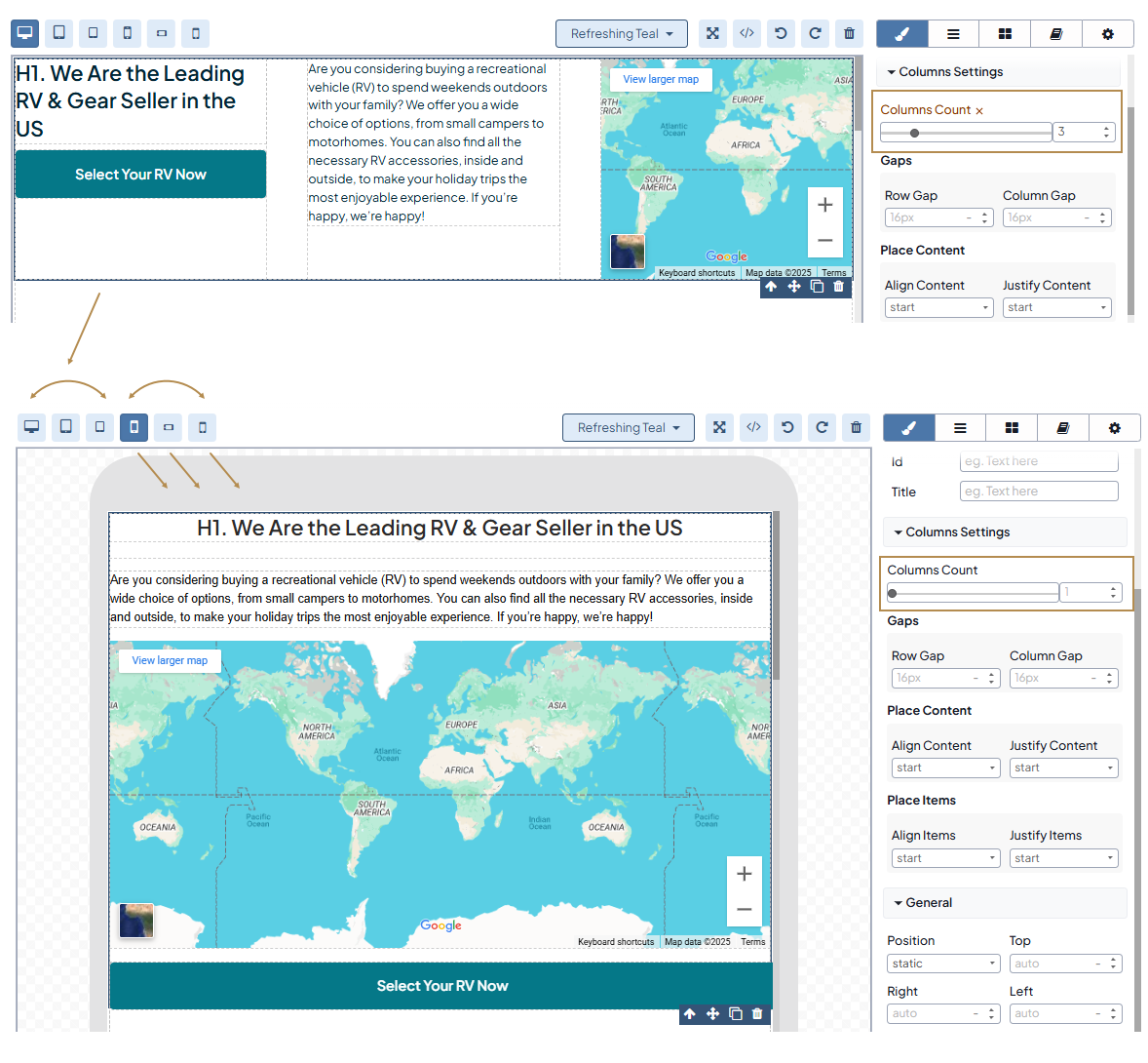 To adjust the number of columns, the gaps between them, and the column content alignment per screen size, click the Columns block on your canvas and configure the required settings under Columns Settings.