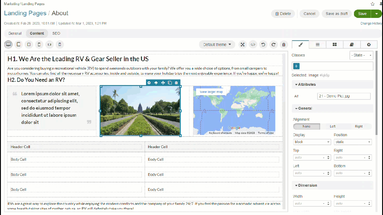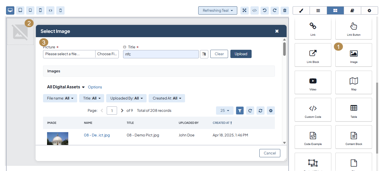 To insert an image to your content, you need to drag the image block to the canvas. Once you click the icon, it will navigate you to the file manager for you to select and add the required image from your local directory or from the list of available DA records.