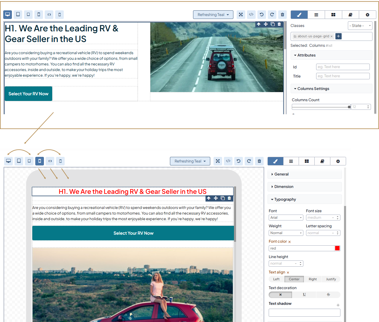 WYSIWYG builder enables you to create a responsive HTML landing page adaptable to different breakpoints (screen sizes). If you are not satisfied with the content representation on a certain breakpoint, you can set the individual formatting of your content for this particular screen size, including different background colors, block dimensions, text alignment, and others. For this, select the display type and customize the settings appropriately. View the results dynamically by switching from one display to another.