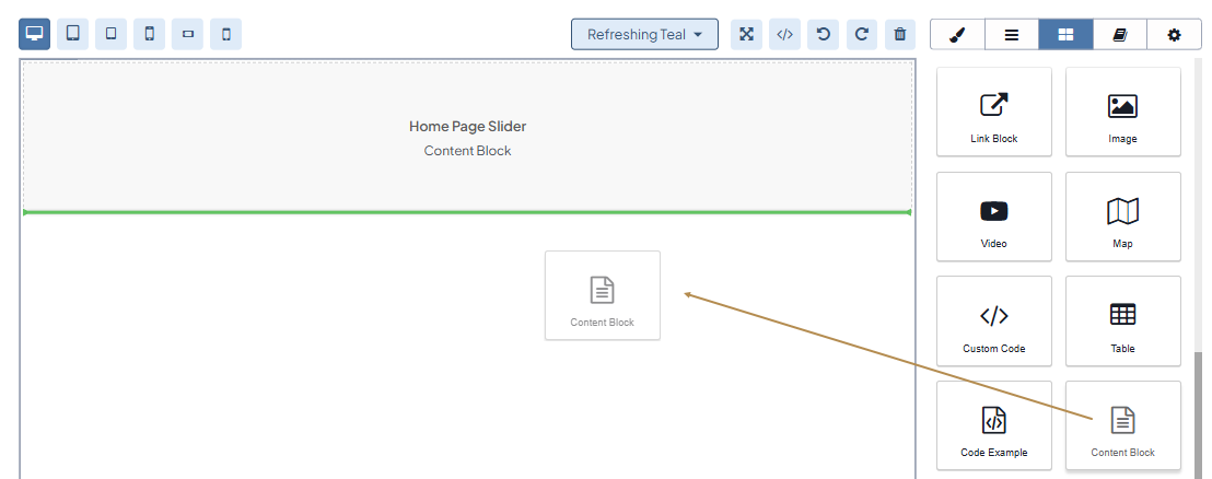 To add a content block to your web page, you need to drag the content block to your canvas and select the required one from the list of available content block that you have previously created and saved.