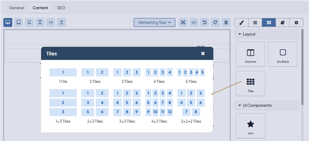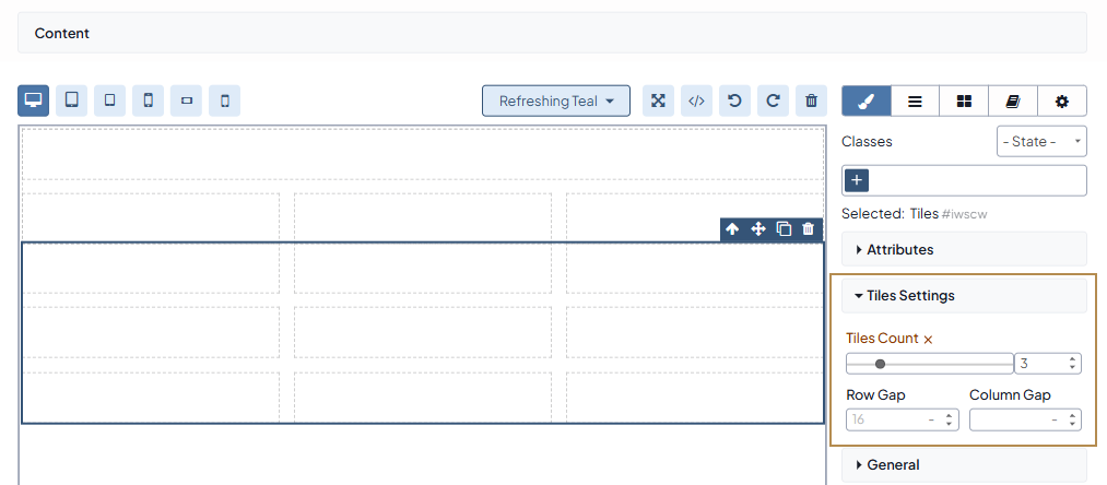 To adjust the number of tiles and the gaps between them per screen size, click the Tiles block on your canvas, and configure the required settings under Tiles Settings.