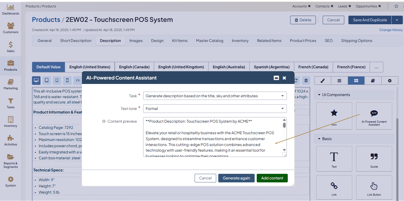 When OroCommerce is integrated with AI clients such as OpenAI or Vertex AI, you can use an AI-Powered Content Assistant widget in the WYSIWYG editor to generate content for product descriptions, landing pages, content blocks, master catalog categories, and emails.