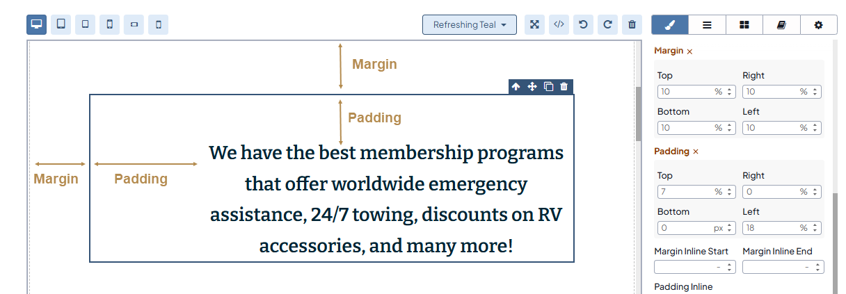 To increase or reduce the image size per breakpoint, drag the sizing handle or use the Dimension menu to set the required size and margins of the image.