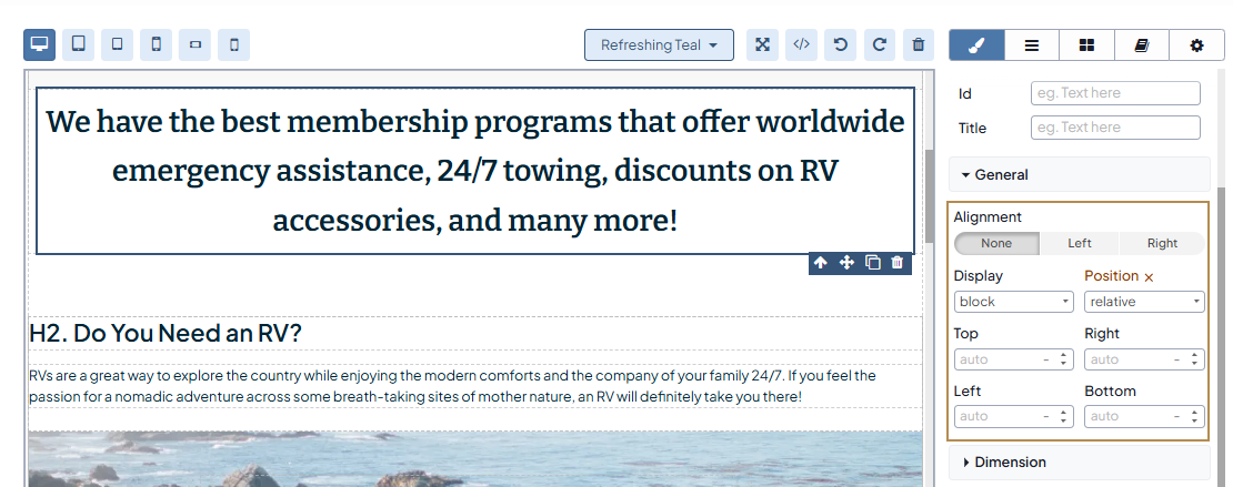 In the General section, select the required value in the Display and Position options. This allows you to relocate the block on the web page by changing the top, right, left, and bottom values.