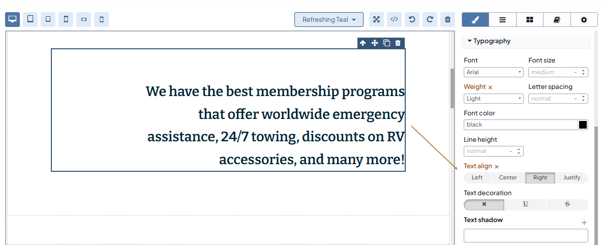 You can change the text alignment, font size, letter spacing, color of the text, and its background under the Typography and Decorations style manager menu of a particular screen size.