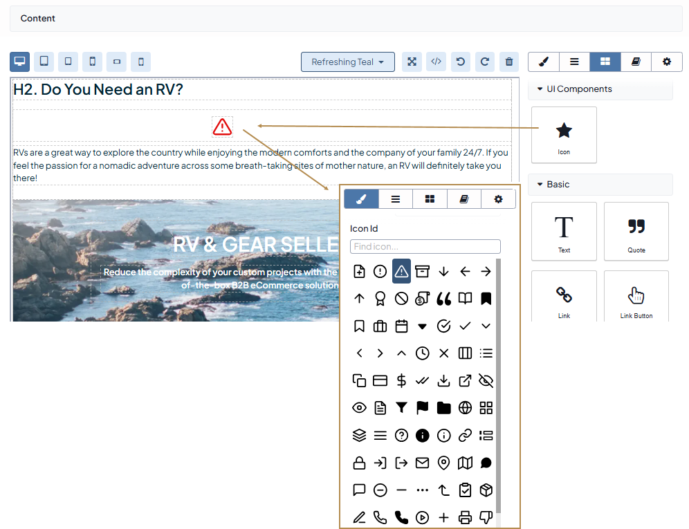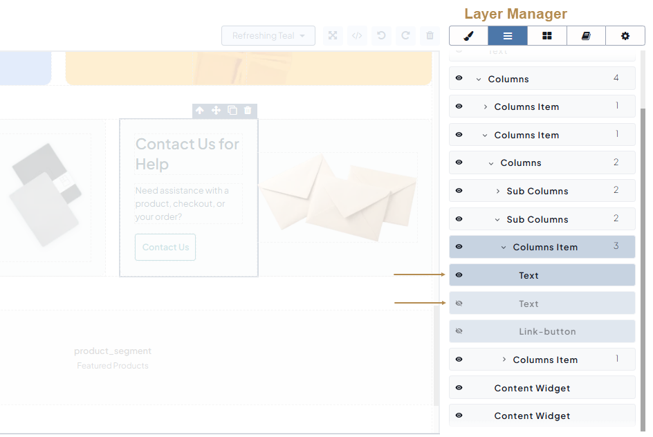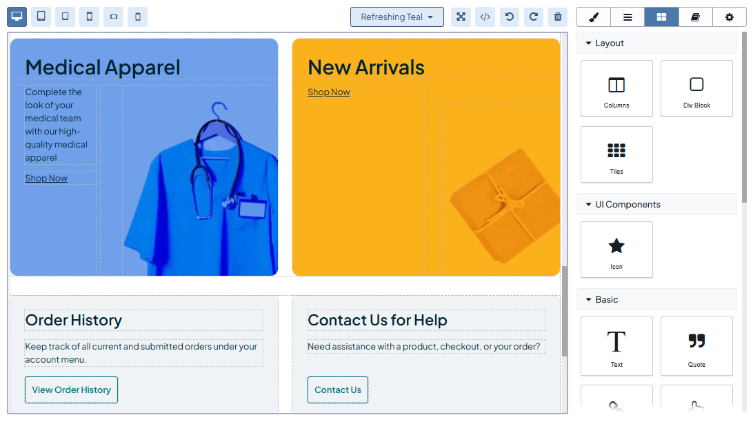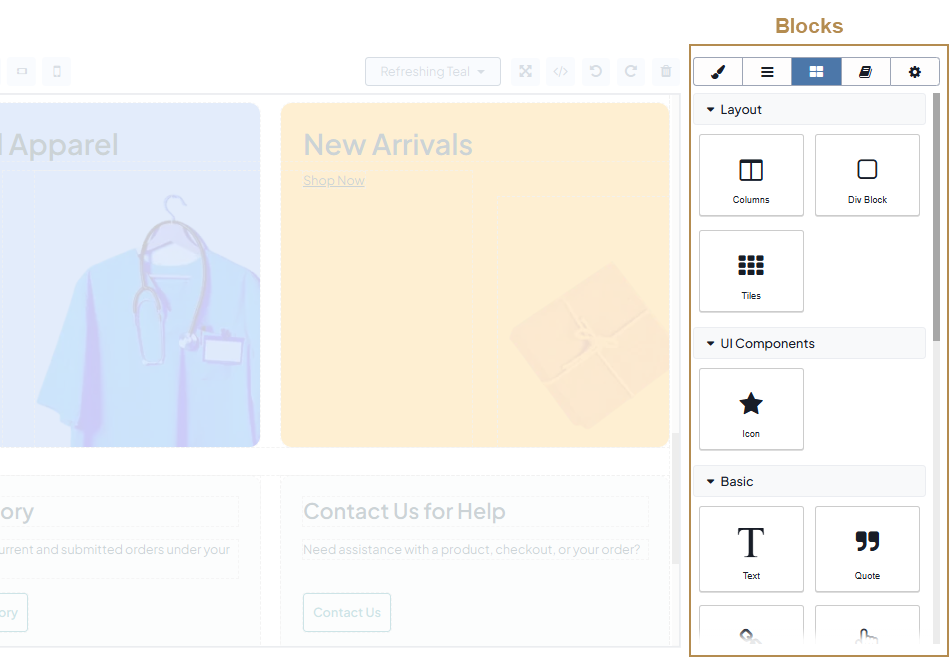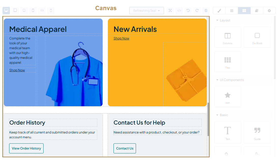 Canvas — A field with the appropriate HTML-like content to be displayed in the storefront. Within the canvas, you can move, copy, or delete the components, and format the text inside blocks.