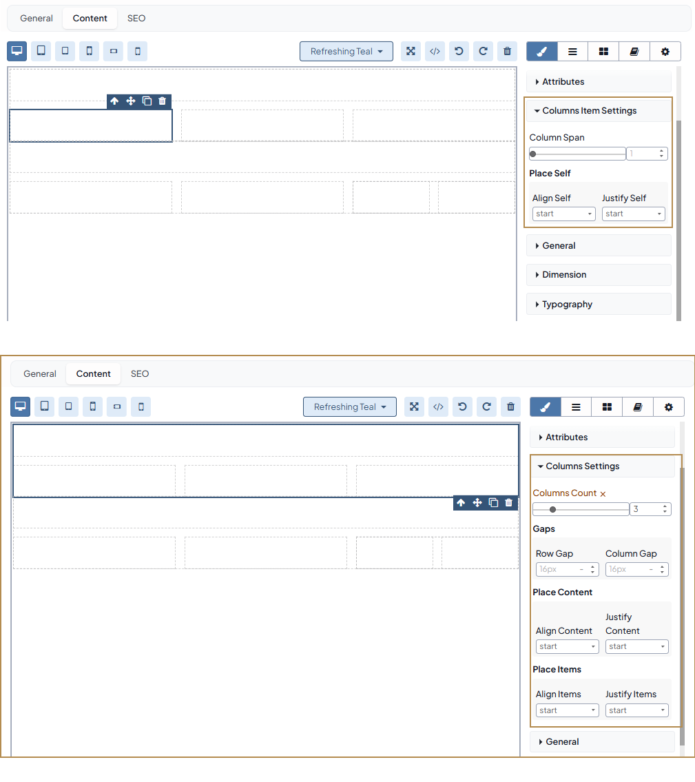 A new setting, Columns/Columns Item Settings, is added along under the Style Manager menu that enables you to adjust the number of columns, the gaps between them, and the column content alignment.