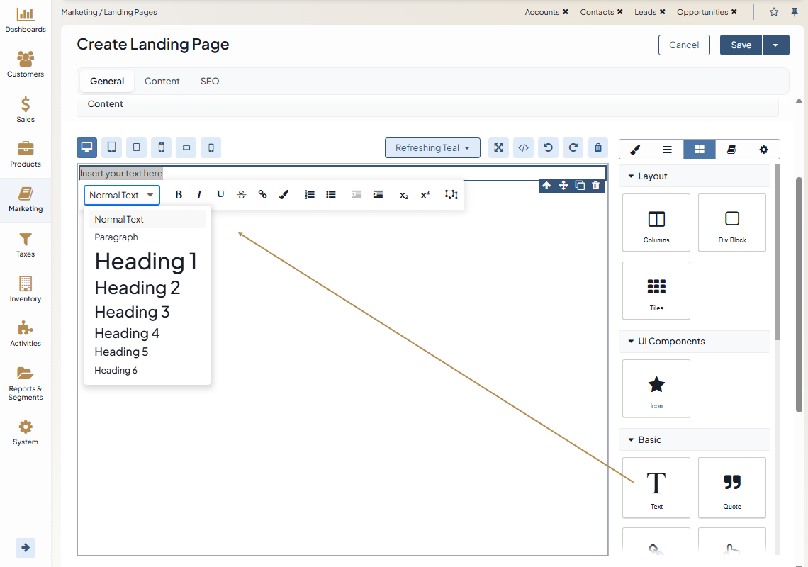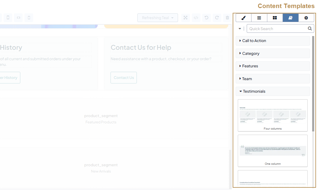 Content Templates — A list of content templates grouped by the tags assigned to them. Templates serve as pre-designed content blocks that you can drag to the canvas and modify their fonts, styles, etc. as the page requires.