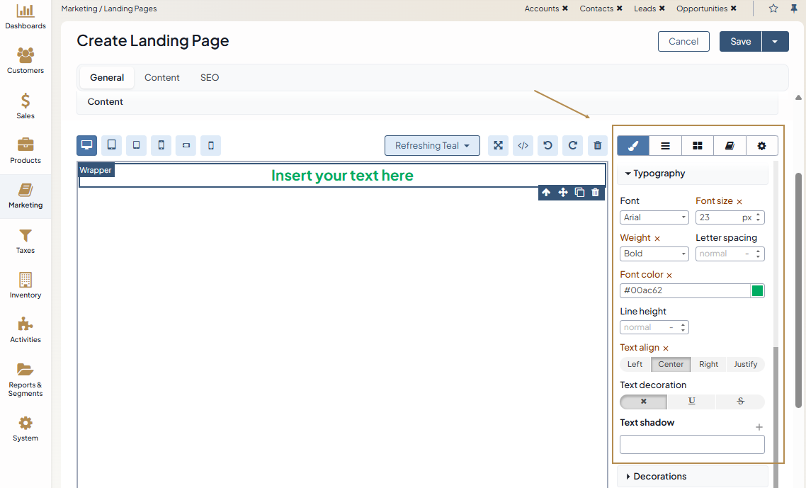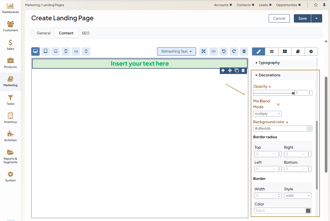 To set the opacity of the text block and add its background color, use the Decorations section of the Style Manager Block.