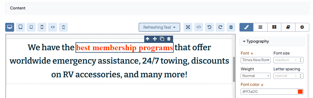 To apply different font faces, sizes, and colours to the whole text block, use the settings in the Typography section of the Style Manager Block.
