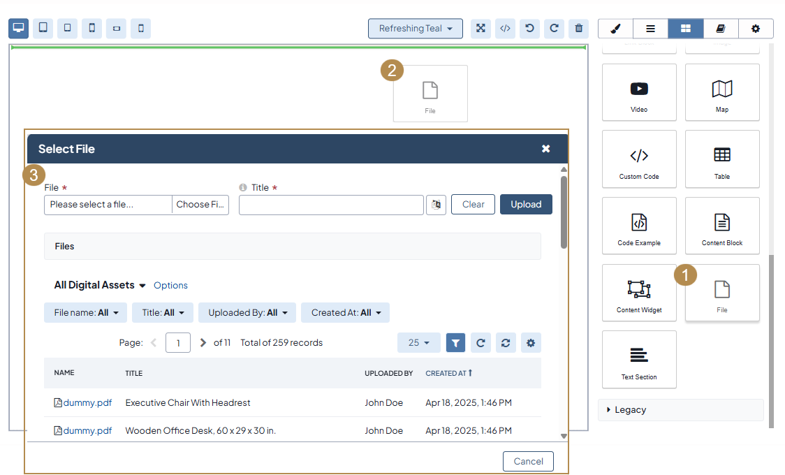 To insert a file to your content, you need to drag the file block to the canvas. Once you click the icon, it will navigate you to the file manager for you to select and add the required file from your local directory or from the list of available DA records.