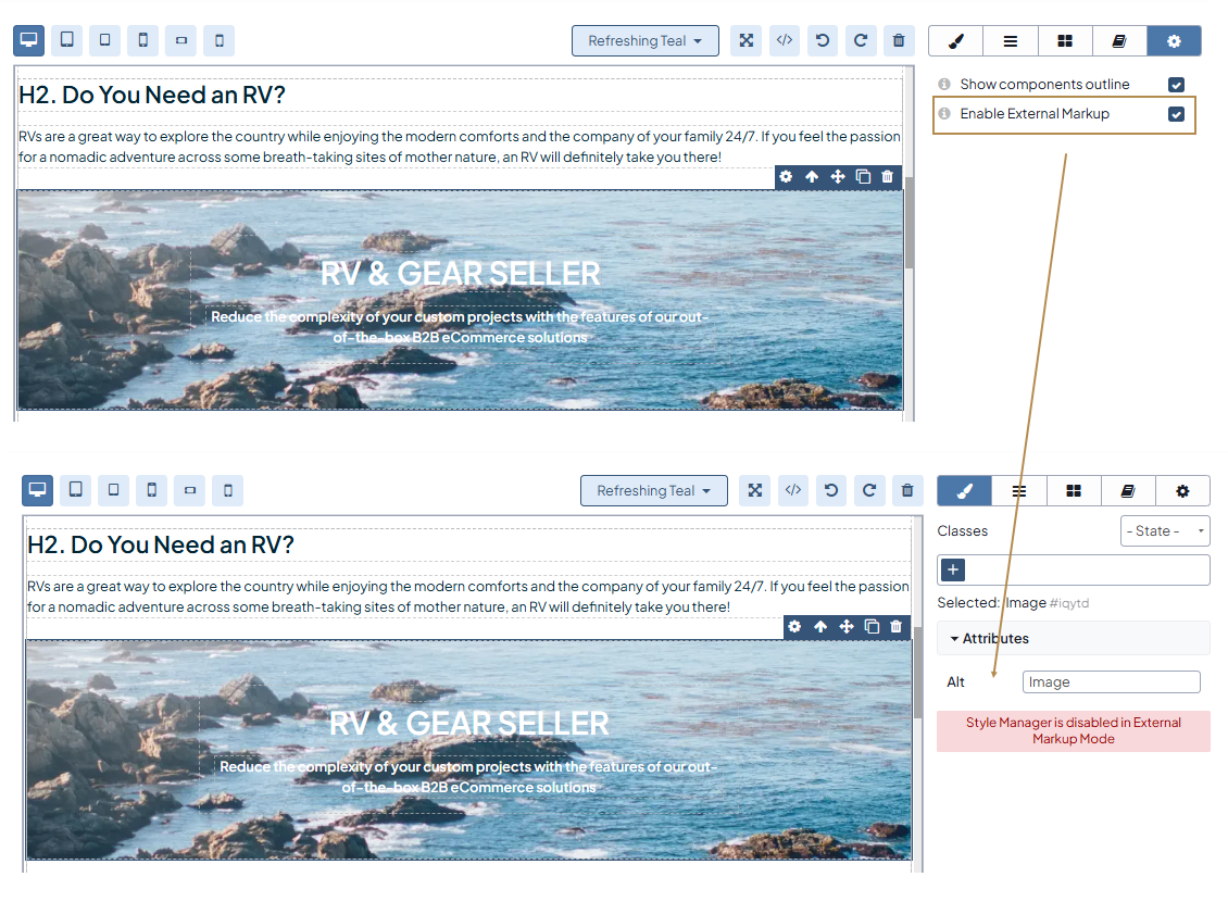 Select the Enable External Markup checkbox. Keep in mind that you will not be able to apply and customize styles of your content. If you exit the external markup mode, the editor may change the source code and break the imported content markup and styles.