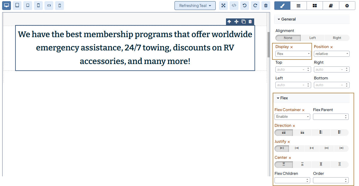 In the General section, select the Flex value for the Display option. Then, enable the flex container under the Flex section and align the text to the required position.
