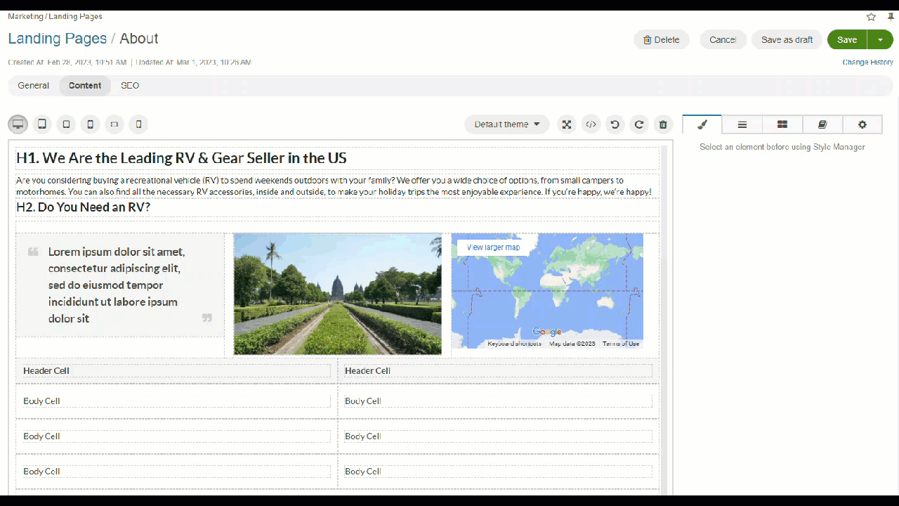 Start modifying the style of the elements by navigating from tab to tab of the WYSIWYG editor’s manager panel.