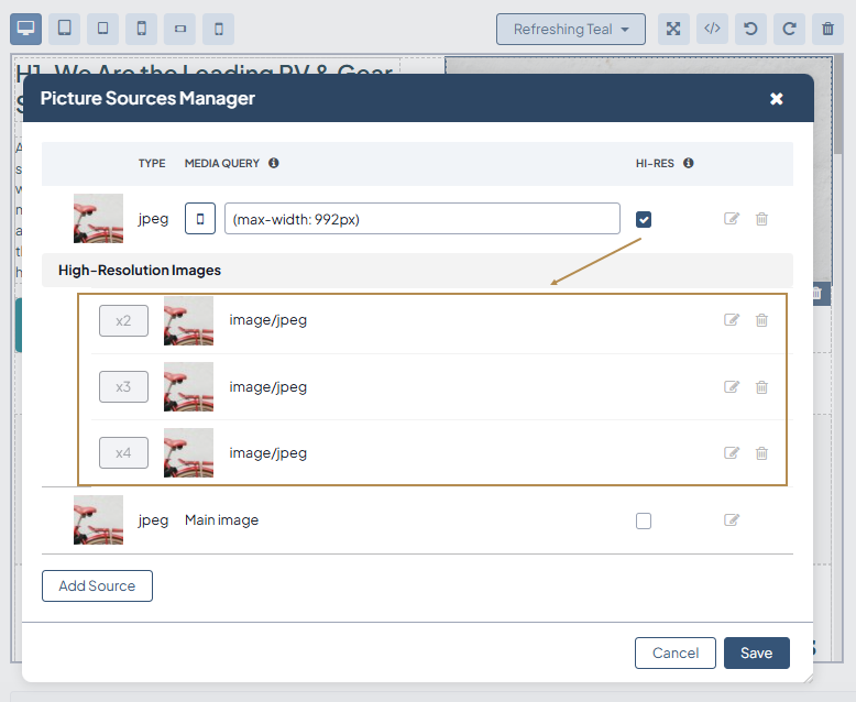 Click the image to display its menu settings. Click to open the Picture Sources Manager menu to view all images assigned to different breakpoints.
