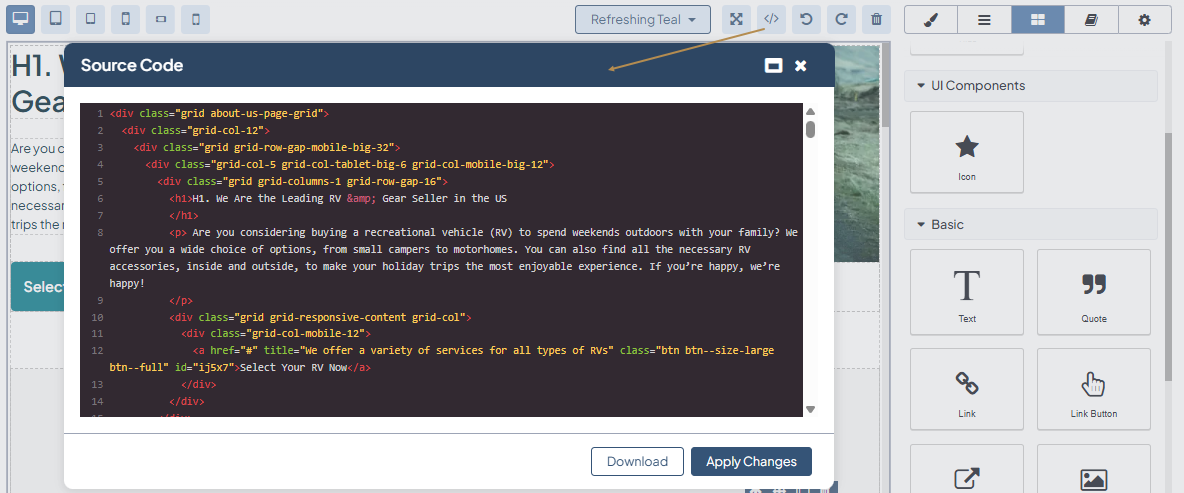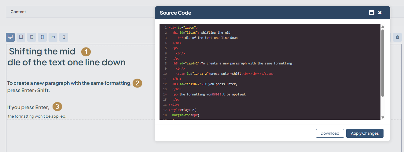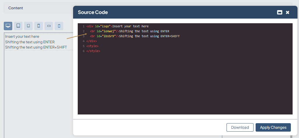 If you are experienced at HTML coding, you can enter your own HTML code into the WYSIWYG editor via the </> Source Code popup dialog. There, you can also edit the existing HTML code that was already applied to the canvas based on the created content.