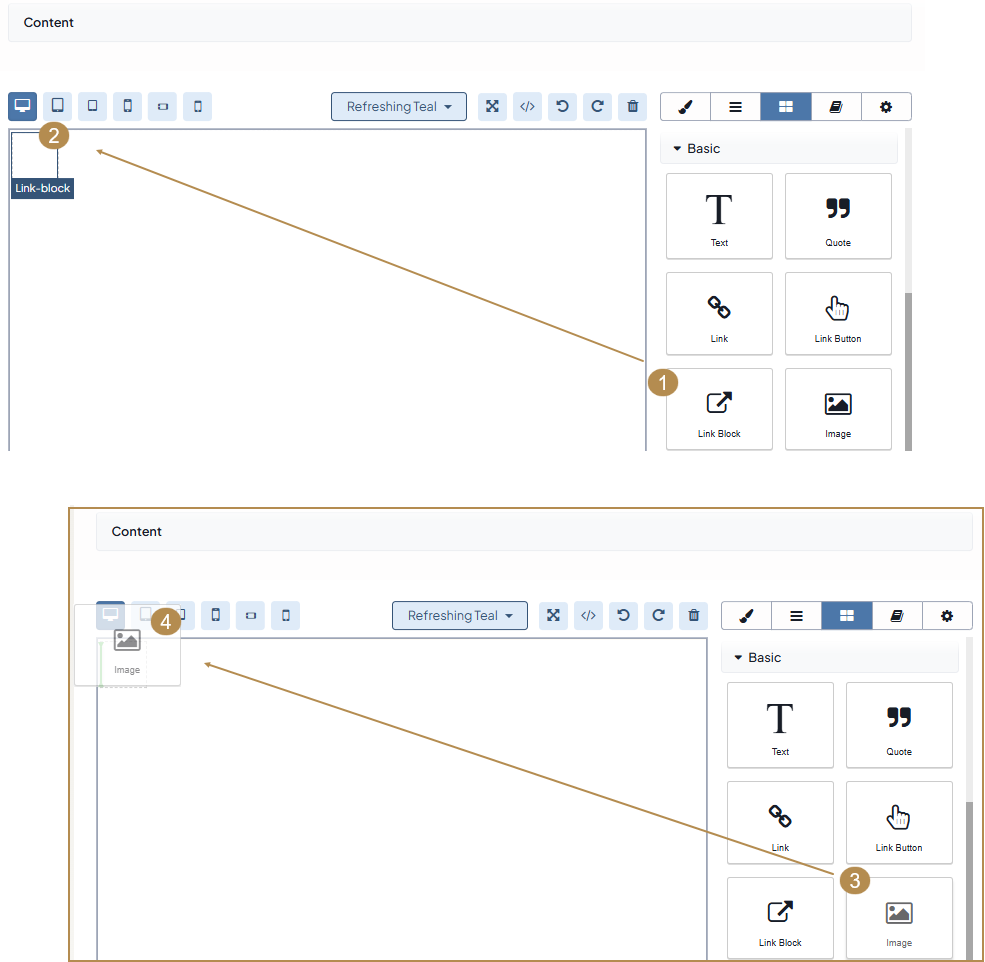 To add a clickable image to your content, you must first insert the Link Block (1,2). Then, place the image block inside the link block (3,4).